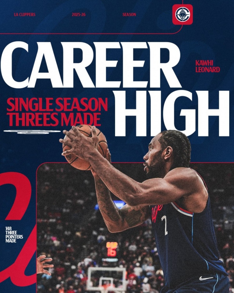 本场比赛过后,伦纳德单赛季已经命中149记三分,创个人生涯新纪录(此前纪录为2016-17赛季的147记)。